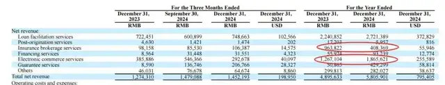保险经纪业务,2024年,收入同比下降58%,接下来可能面临盈利压力;电商业务,全年固然增长明显,只是尚不稳固,个别季度甚至下降。